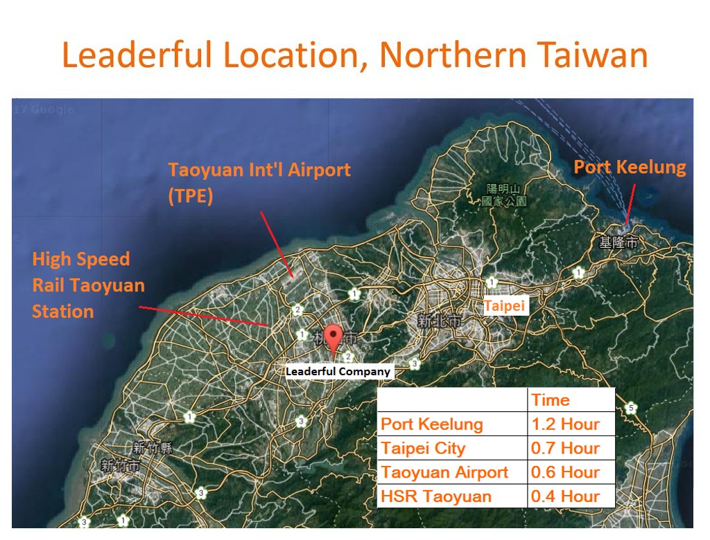 Leaderful Company was established in 2016 at Bade, Taoyuan city- an energetic city in Northern Taiwan. Company is close to Taoyuan International Airport (30 minutes); High Speed Rail (25 minutes) and Port Keelung (70 minutes) etc.