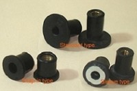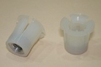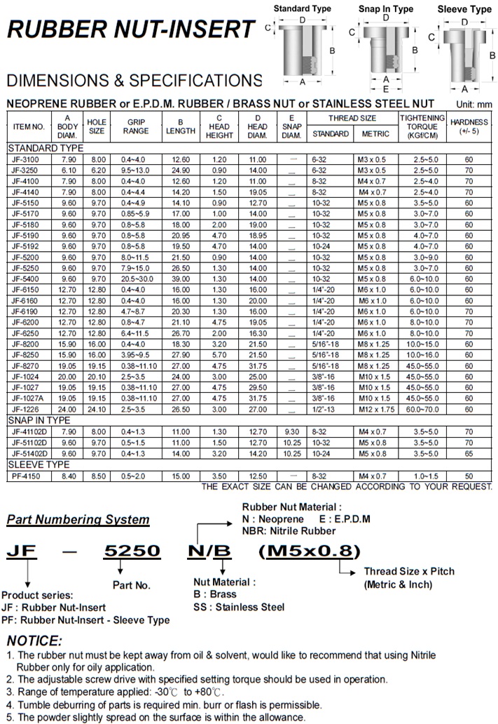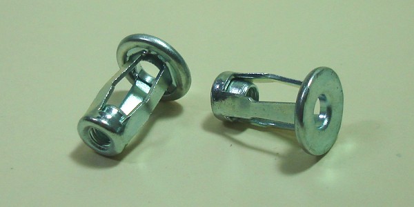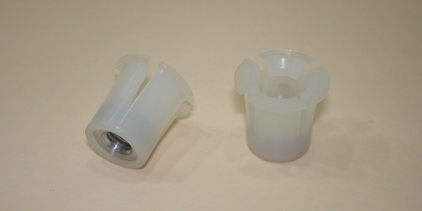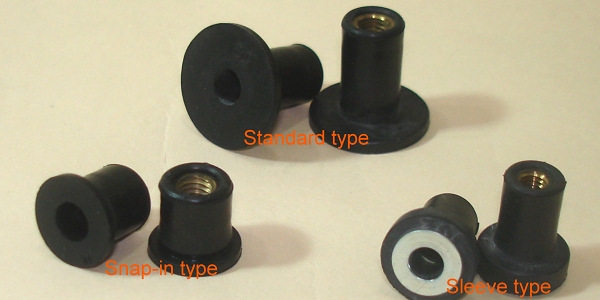 : 用 Neoprene 或 EPDM 做主體材,崁入不銹鋼或黃銅螺帽。操作時以螺絲鎖緊,螺牙部向上推力使身體膨脹變形,退卻螺絲後, 形成鉚合於工件上的螺帽功能。這些優點也許可應用於您的產品設計上: 單向盲孔安裝,可用於薄板工件,或封閉式的深孔中。 可連結兩種不同材質。 吸震隔音絕緣體,抗靜電防水防銹及氣密。