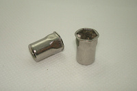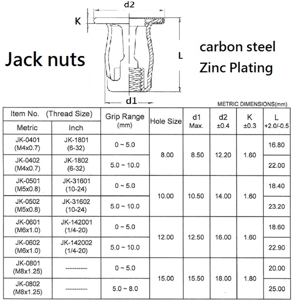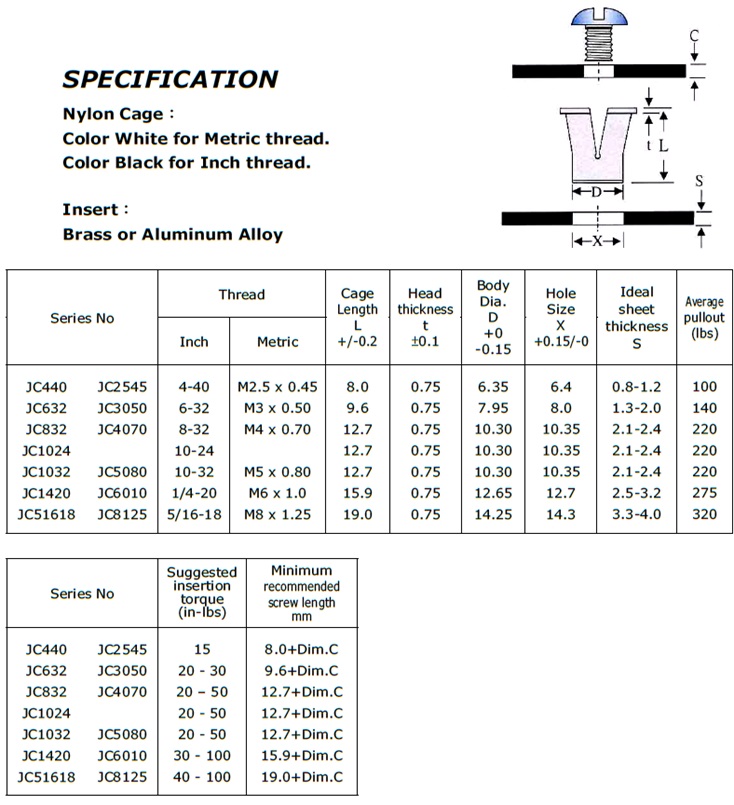 : 這些特色與優點也許可應用在您的產品設計上: 容易安裝且乾淨,不須特殊工具就可安裝。 尼龍喇叭口套管具有彈力,能將拉帽牢牢固定於孔內。 於金屬、玻璃纖維、塑膠及硬板上均可使用。 尼龍套管包覆鋁或銅製螺帽不會發生電位腐蝕等化學作用,並能降低噪音。 有機會重複使用。