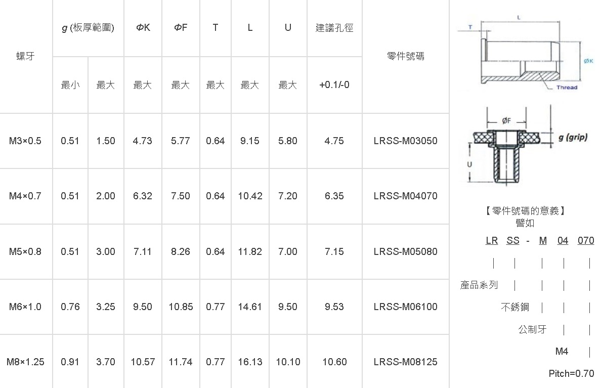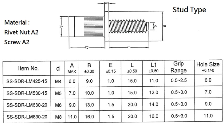 尺寸 平頭附螺栓(規格表) 材料 不銹鋼A2 橡膠拉帽