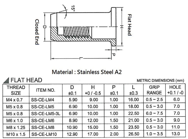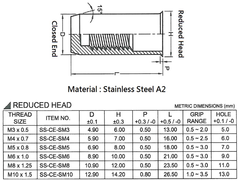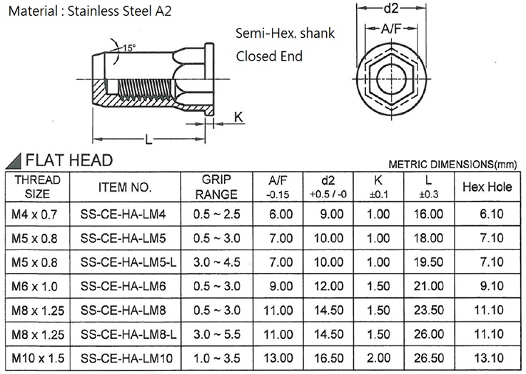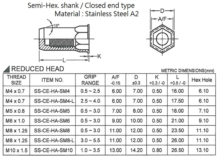 尺寸 小頭(規格表)、平頭(規格表) 材料 不銹鋼A2 CE-HA 型 外型 半六角, 封孔型