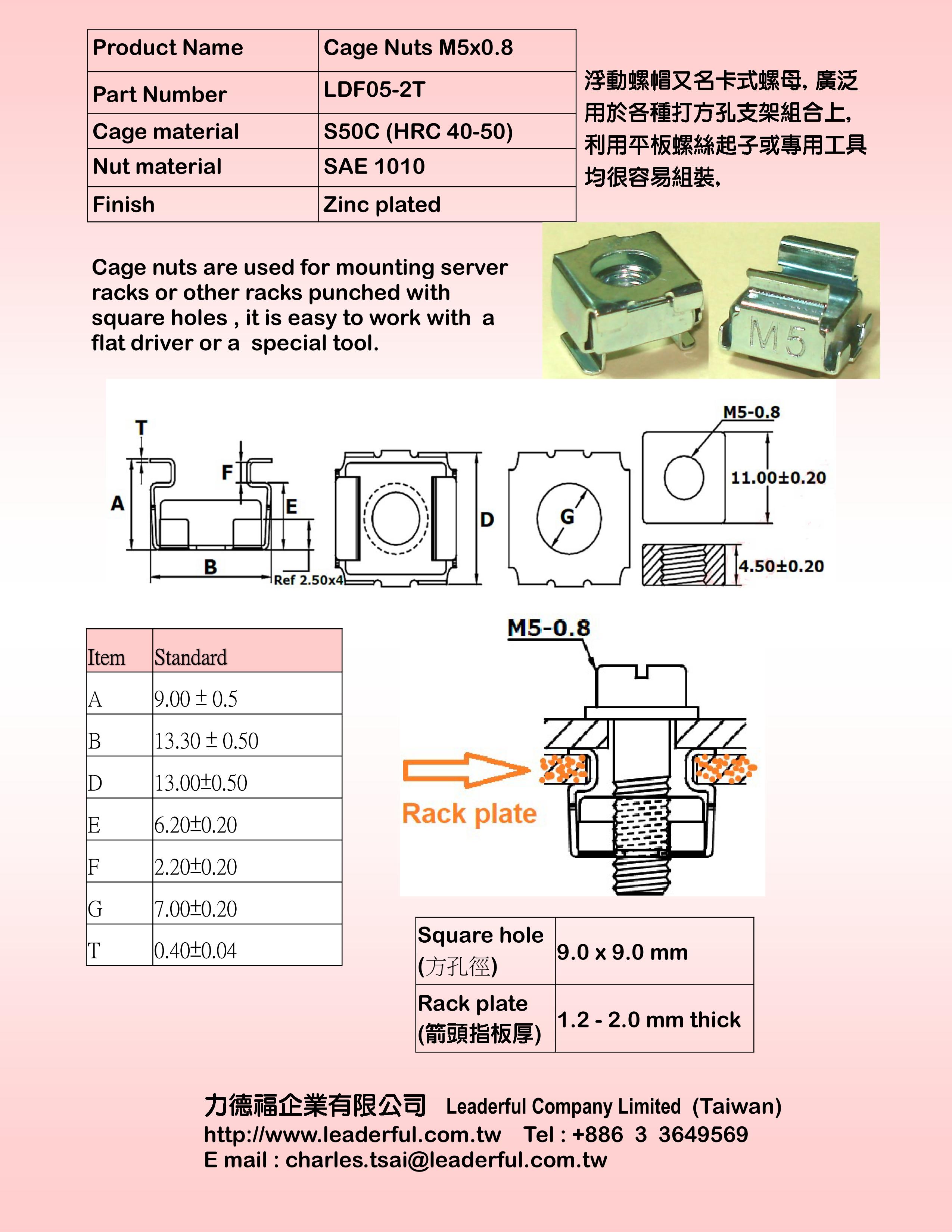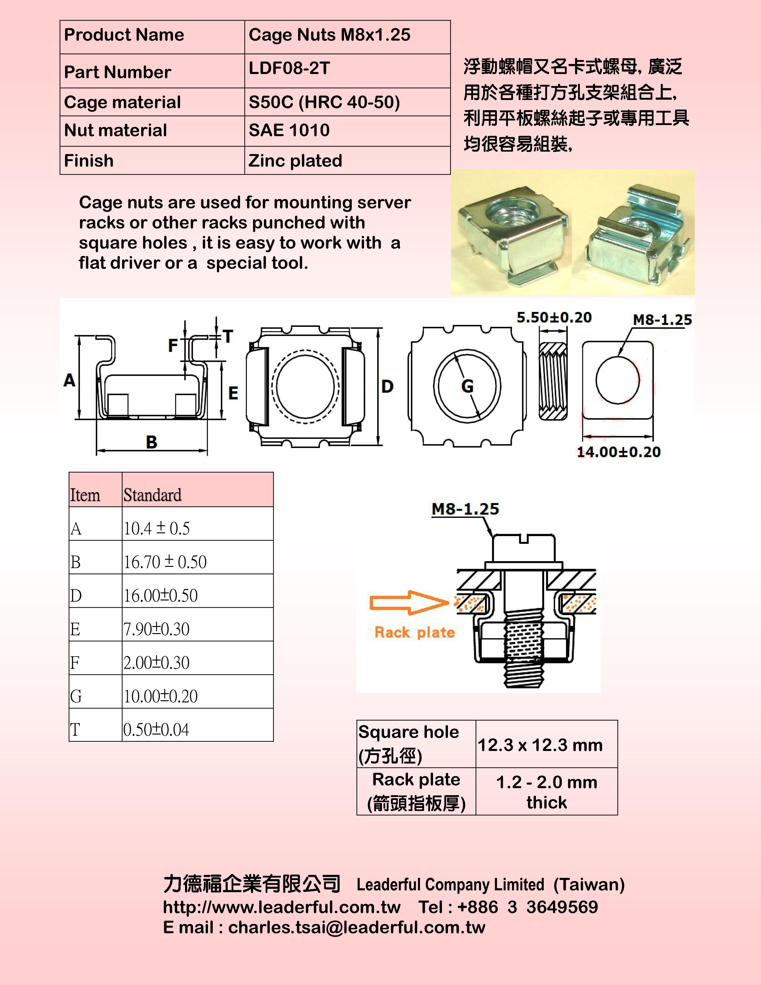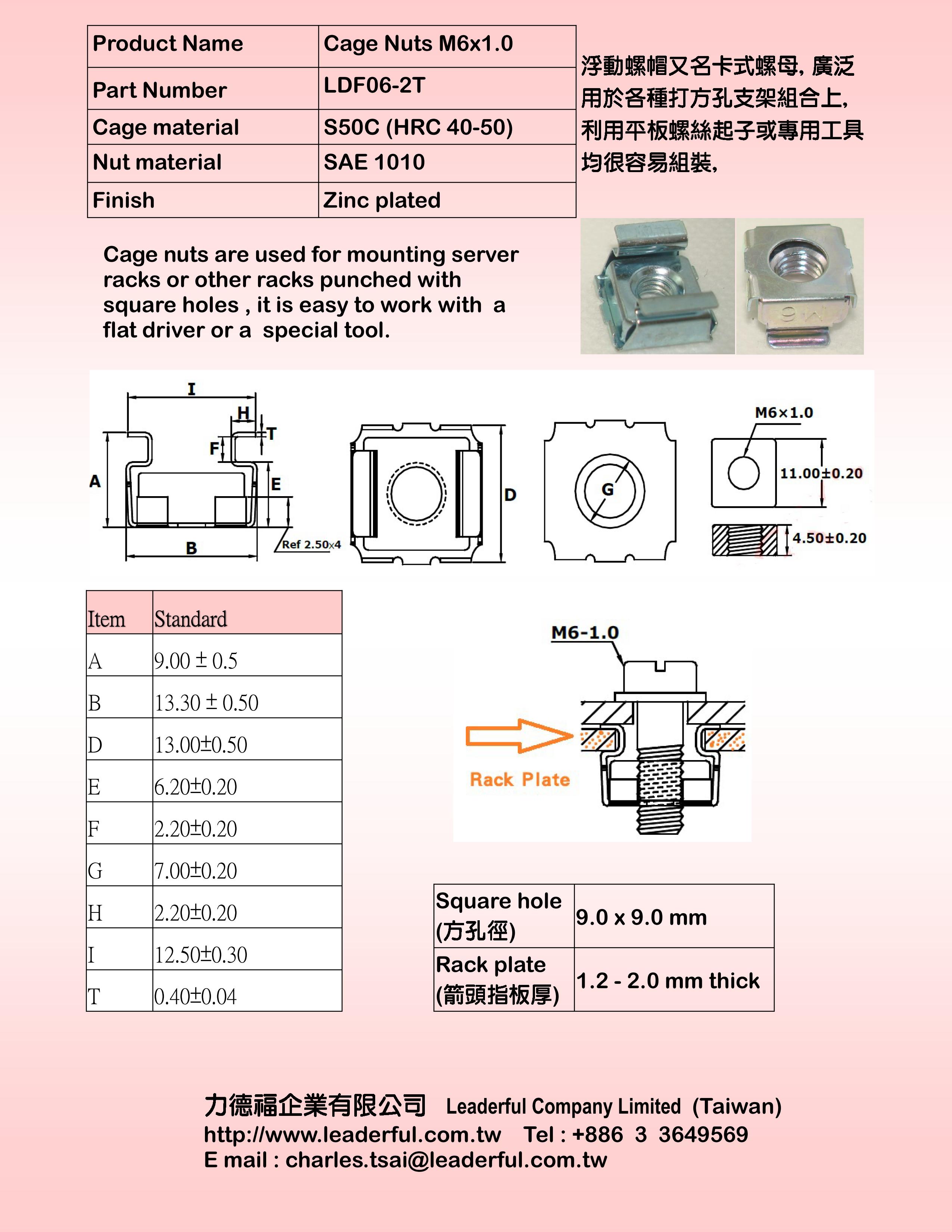 | 浮動螺帽 | M4-M10,規格表( M5, M6, M8 ) 依照客戶要求尺寸及電鍍。 又名卡式螺母、籠型螺帽。 另有不銹鋼SUS304製品歡迎洽詢。 |